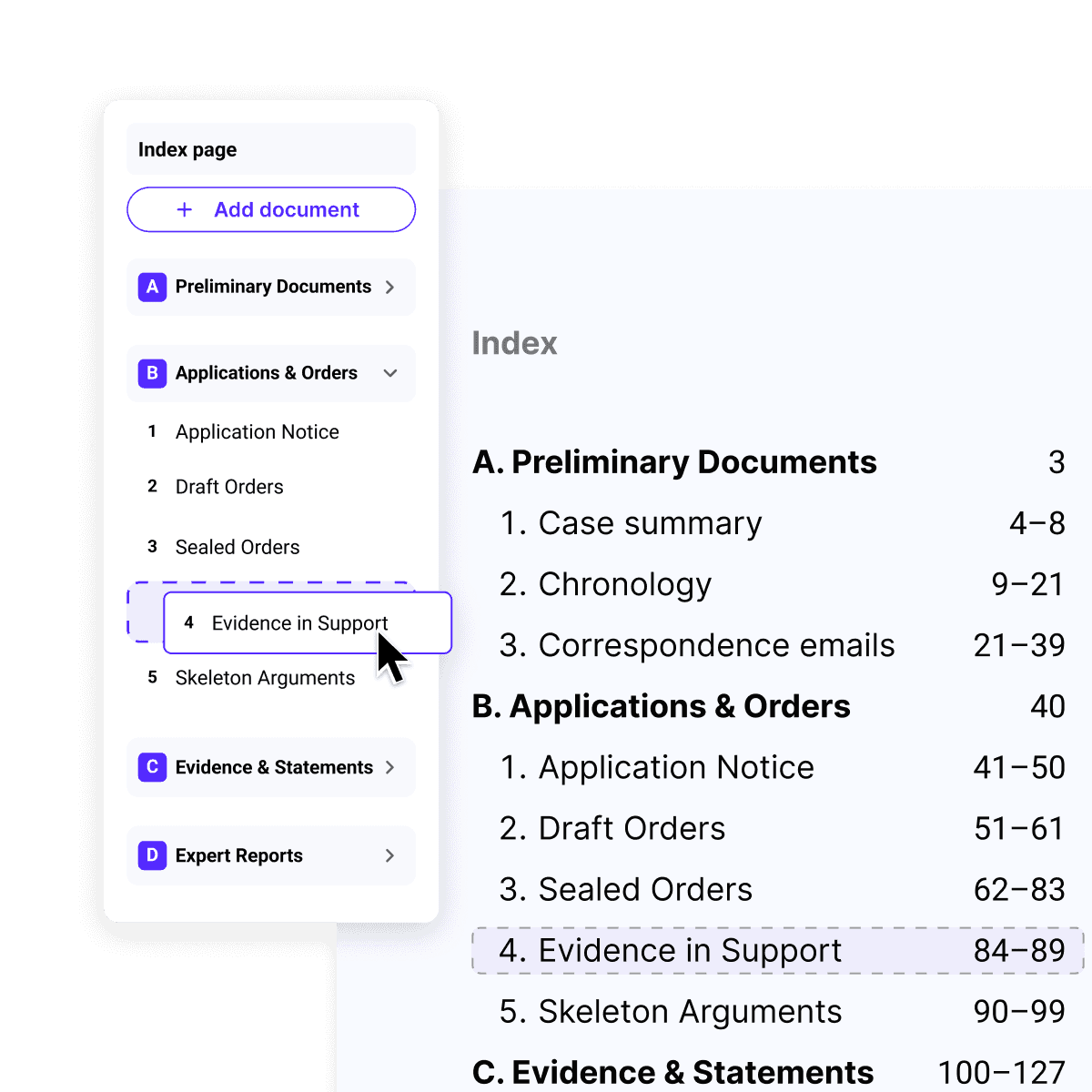 Constantly renumbering pages and updating indexes wastes valuable time and risks errors. Sortal keeps your bundles accurate and ready for court.