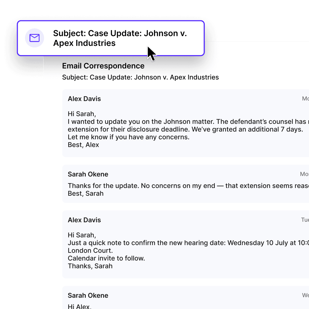 Dense legal communications bury critical details, cause confusion, and slow case preparation. Sortal helps legal teams stay in control and focused.