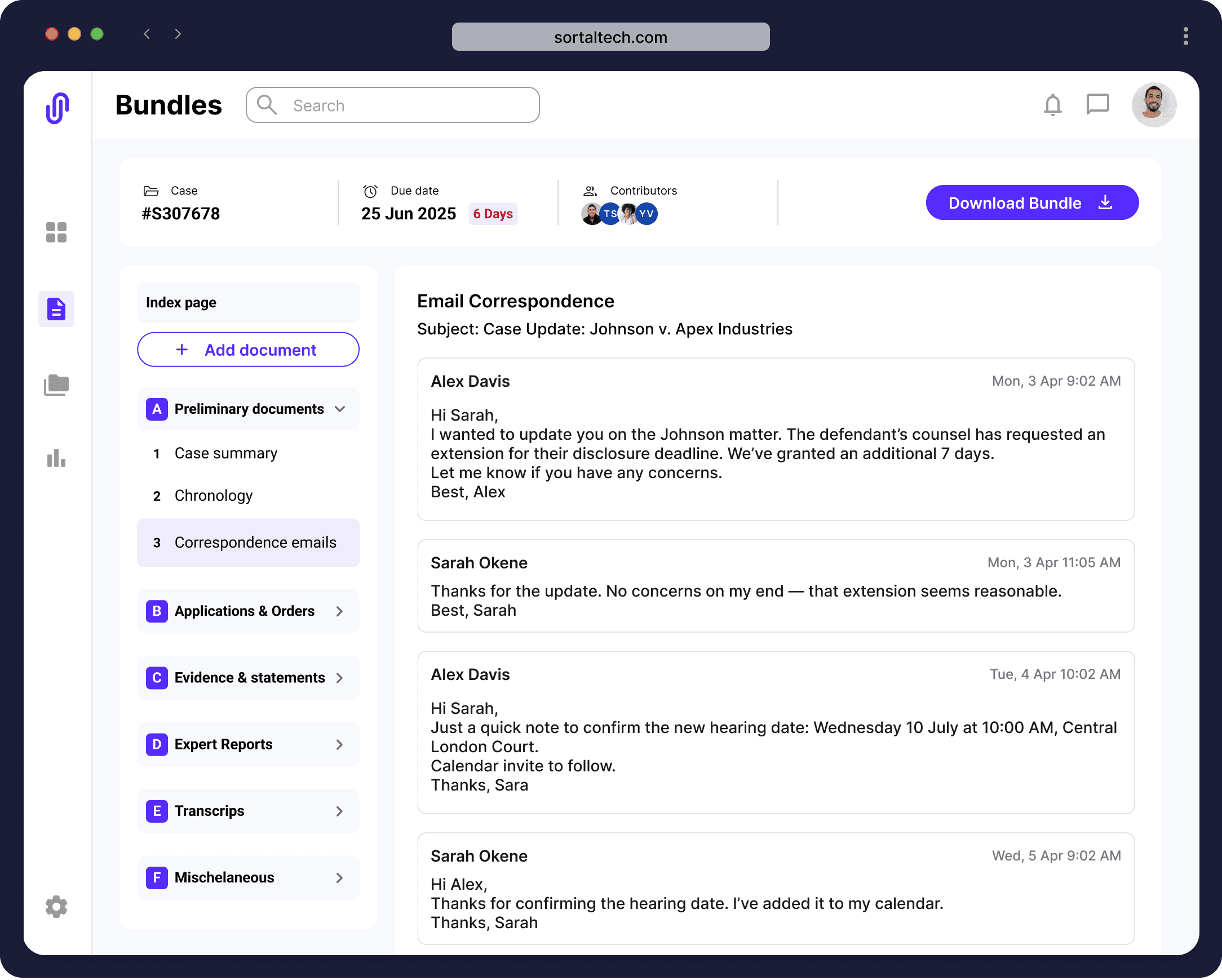 Sortal is the fastest, simplest way to create professional legal bundles anytime, anywhere - with smart organisation, effortless editing, and automatic formatting, so your team can focus on what matters most.